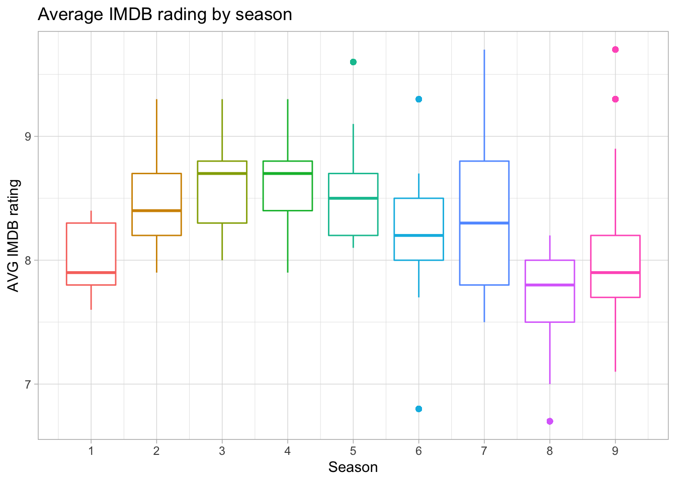 ggplot(aes(season, imdb_rating, group = season, color = factor(season))) +