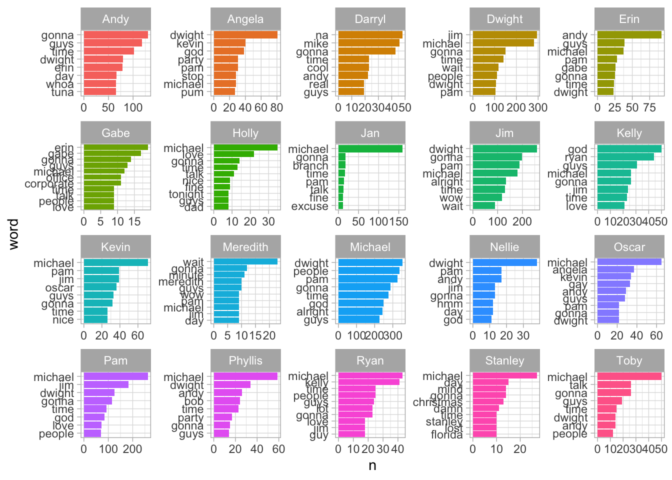 slice_max(n, n = 50)Most words in The Office