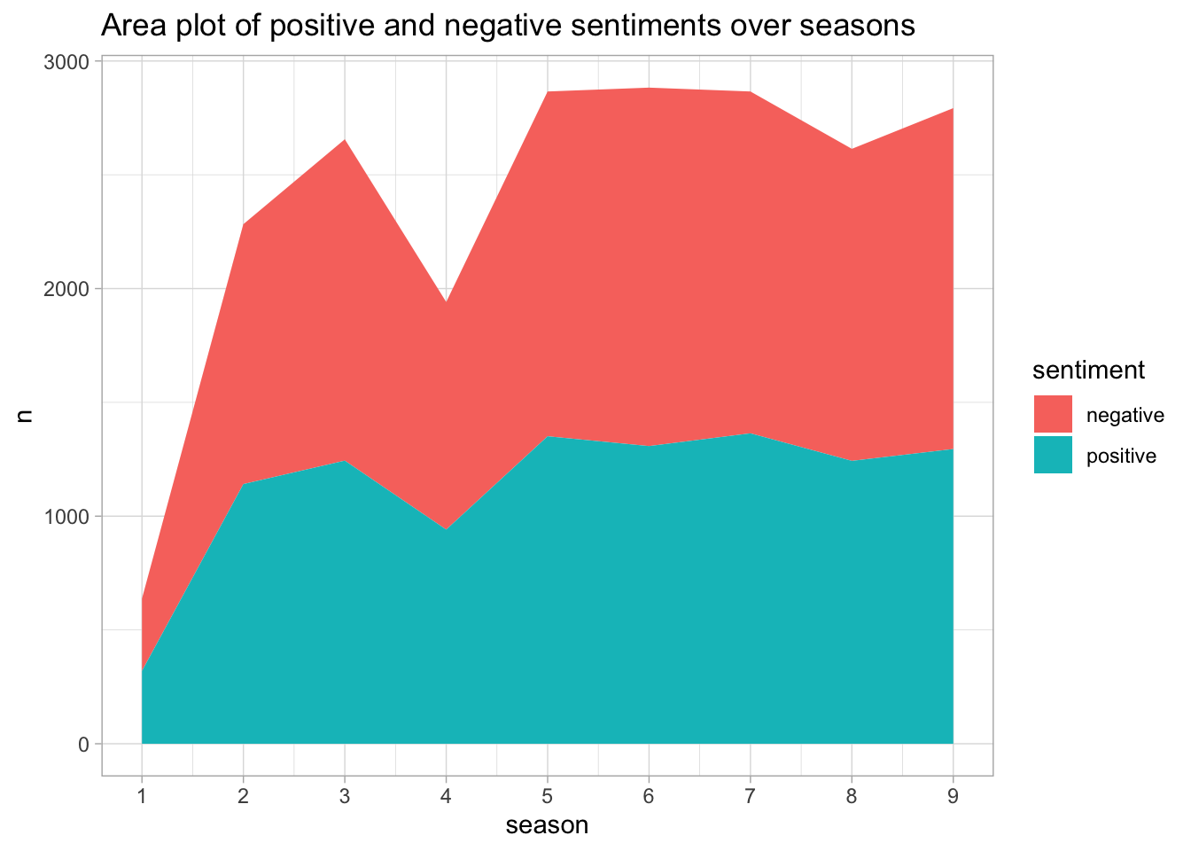 labs(title = 'Area plot of positive and negative sentiments over seasons')
